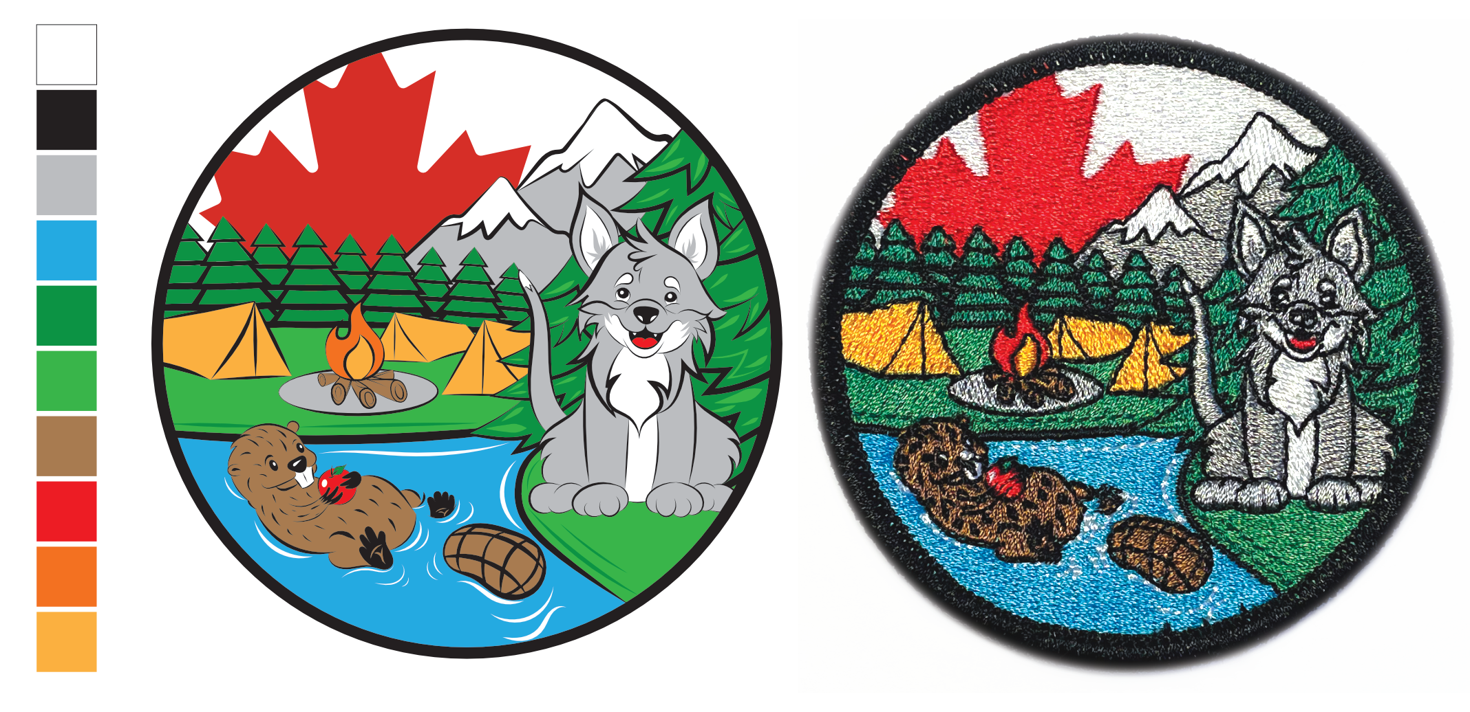 Designed for my Scout group in Canada, this badge represents the four stages of the Scouting movement through a shift from character to symbol. Beavers and Cubs are shown through illustrated animals, while Scouts and Ventures move toward abstraction, reflecting increasing independence. Camping tents mark the transition to self-led exploration, with mountains representing the Venture stage and life beyond the group. As a formal uniform element, the badge needed to read clearly at a distance while holding up through repeated use.